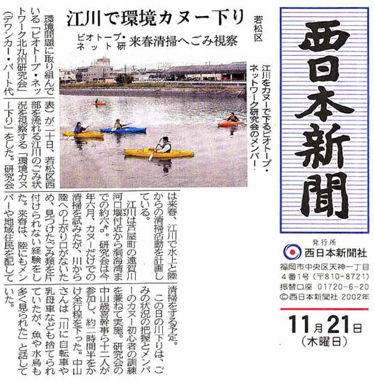 「江川で環境カヌー下り」ビオトープ・ネット研 来春清掃へごみ視察、西日本新聞