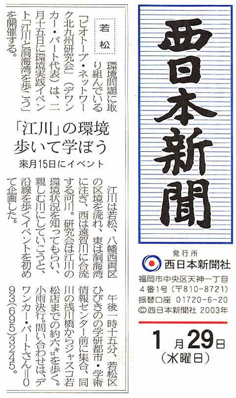 「江川の環境歩いて学ぼう」、2003年1月29日、西日本新聞