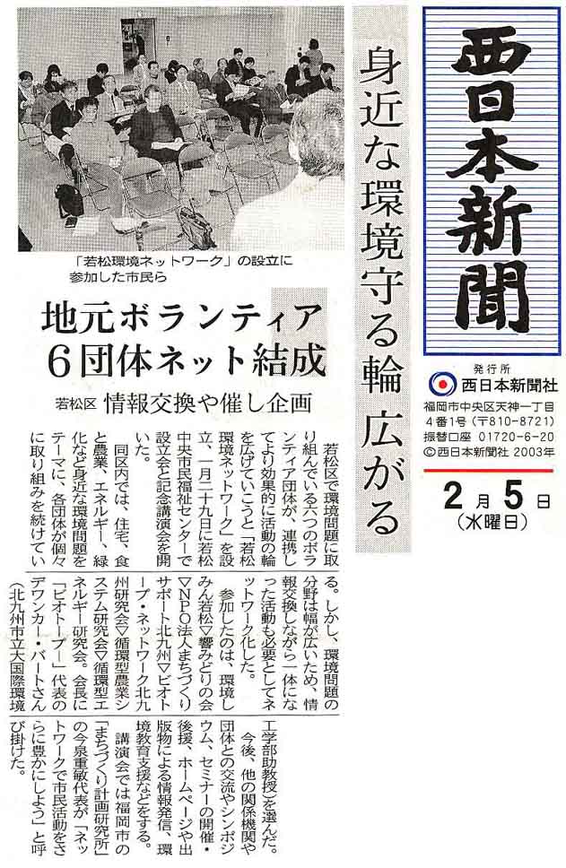 「身近な環境守る輪広がる・地元ボランティア6団体ネット結成」、西日本新聞