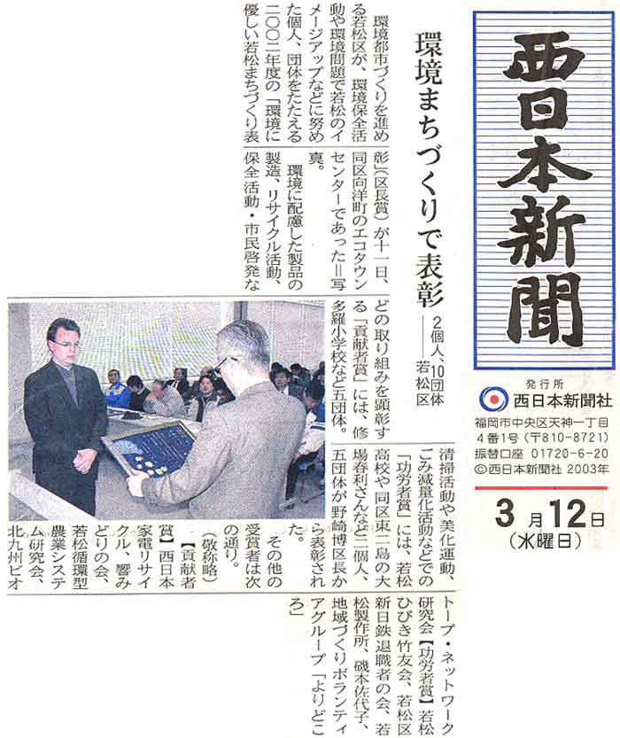 2003年3月11日、「環境まちづくりで表彰」、西日本新聞