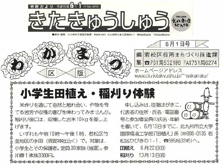 2003年6月1日、「小学生 田植えと稲刈り体験」、きたきゅうしゅう市政だより
