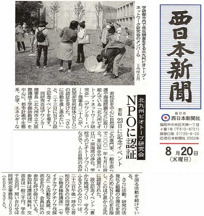 2003”N8ŒŽ20“úAu–k‹ãBƒrƒIƒg[ƒvŒ¤‹†‰ïNPO‚É”FØvA¼“ú–{V•·