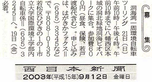 2003年9月12日、「洞海湾一周環境自転車ツーリング」、西日本新聞