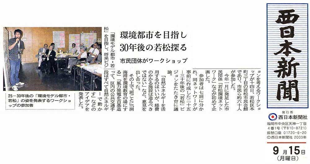 2003年9月15日、「環境首都を目指し30年後の若松探る 市民団体がワークショップ」、