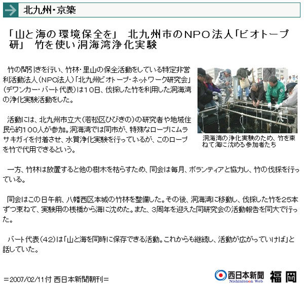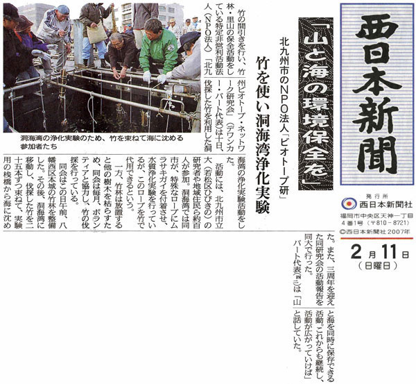 2007年2月11日、「山と海の環境保全を、竹を使い洞海湾浄化実験」、西日本新聞