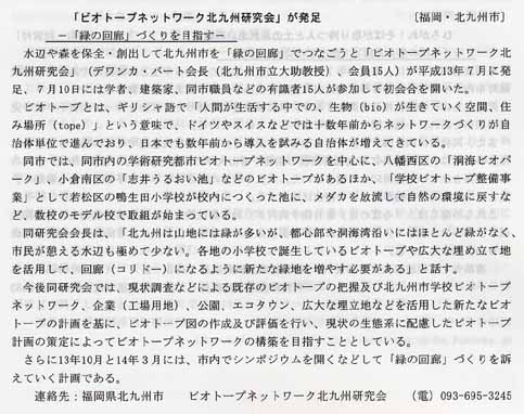 「ビオトープ・ネットワーク北九州研究会」が発足、「緑の回廊」づくりを目指す、