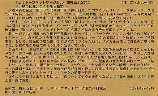 「ビオトープ・ネットワーク北九州研究会」が発足、「緑の回廊」づくりを目指す、
